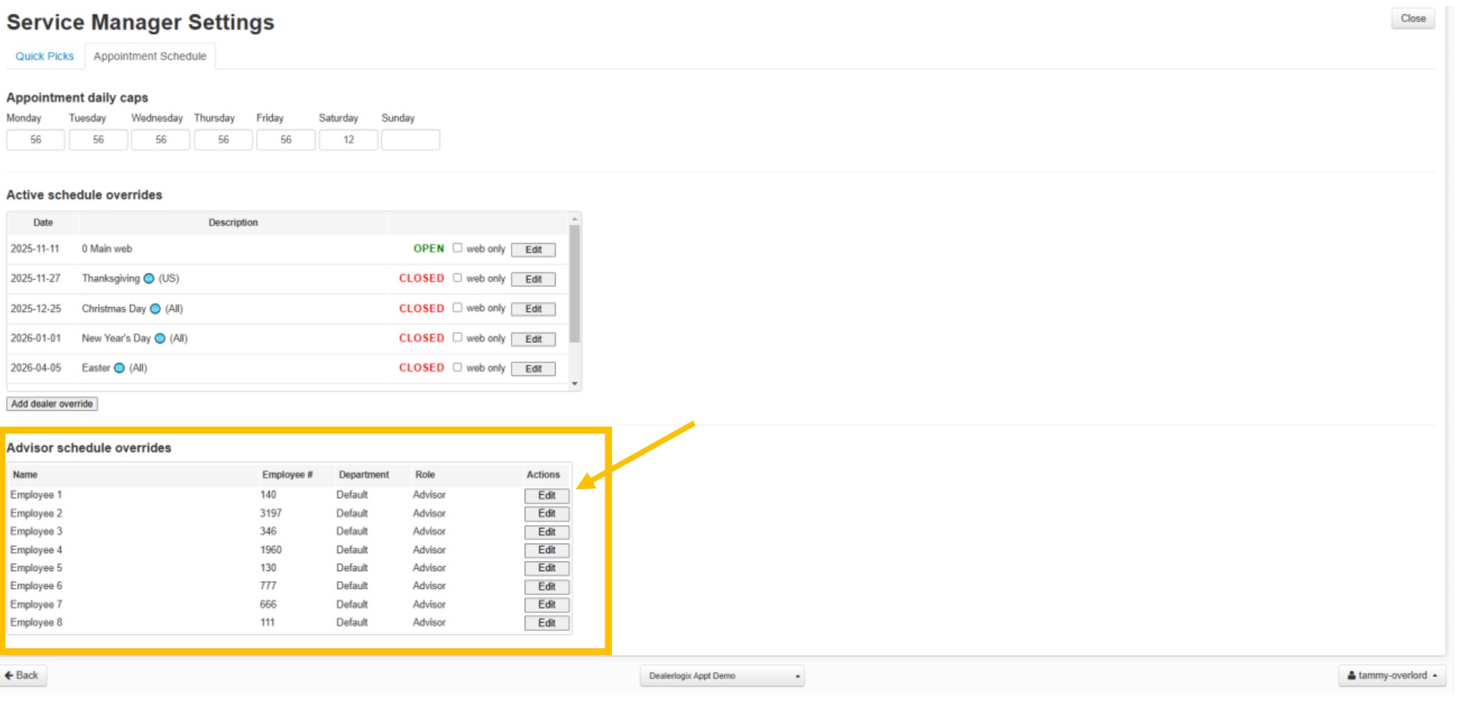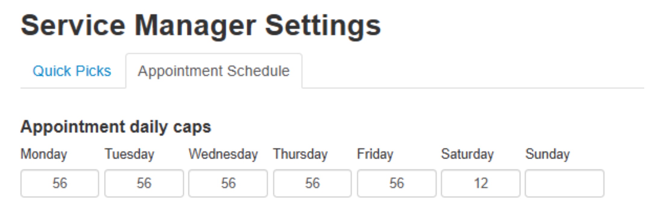 1. Managing appointment daily caps via “Service Manager Settings”.