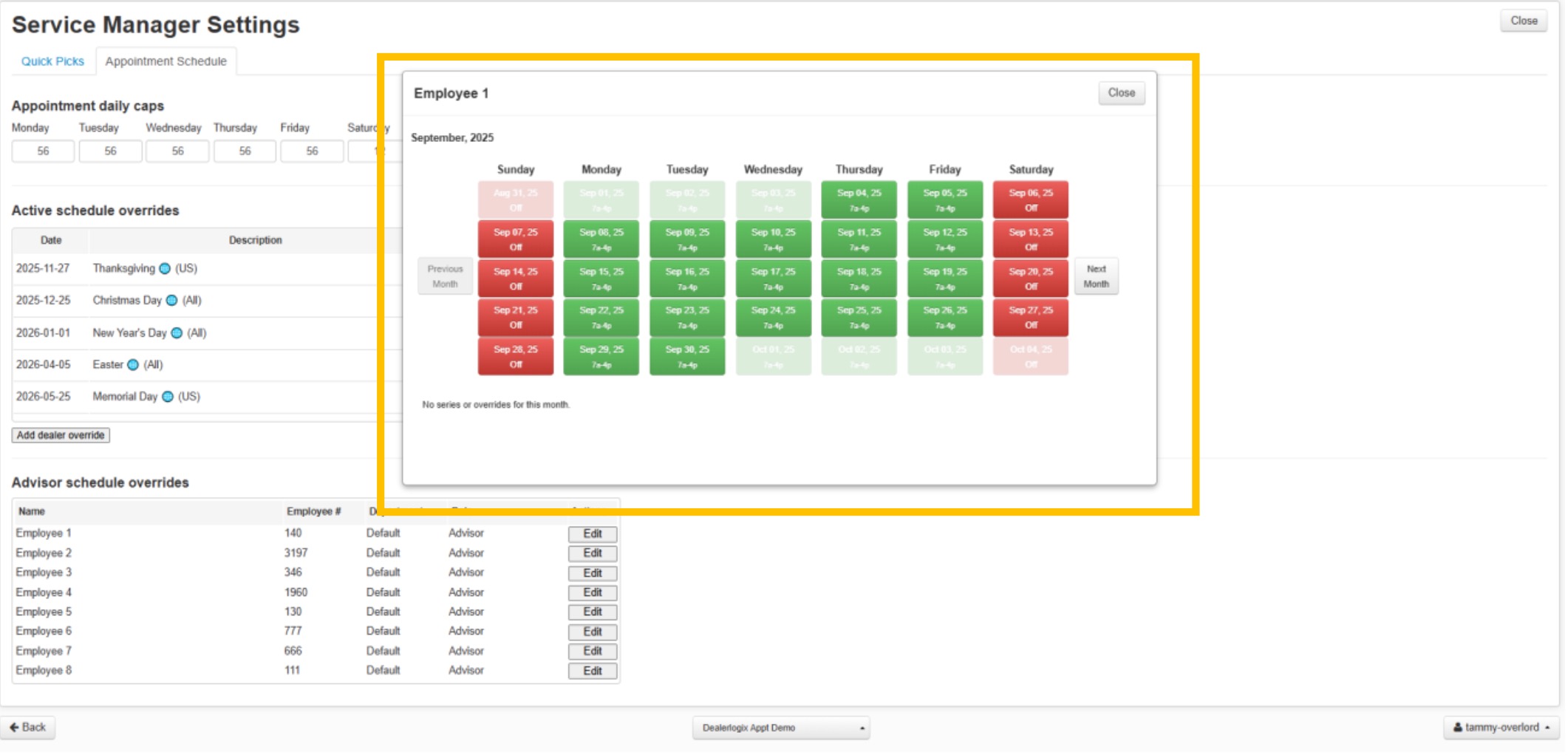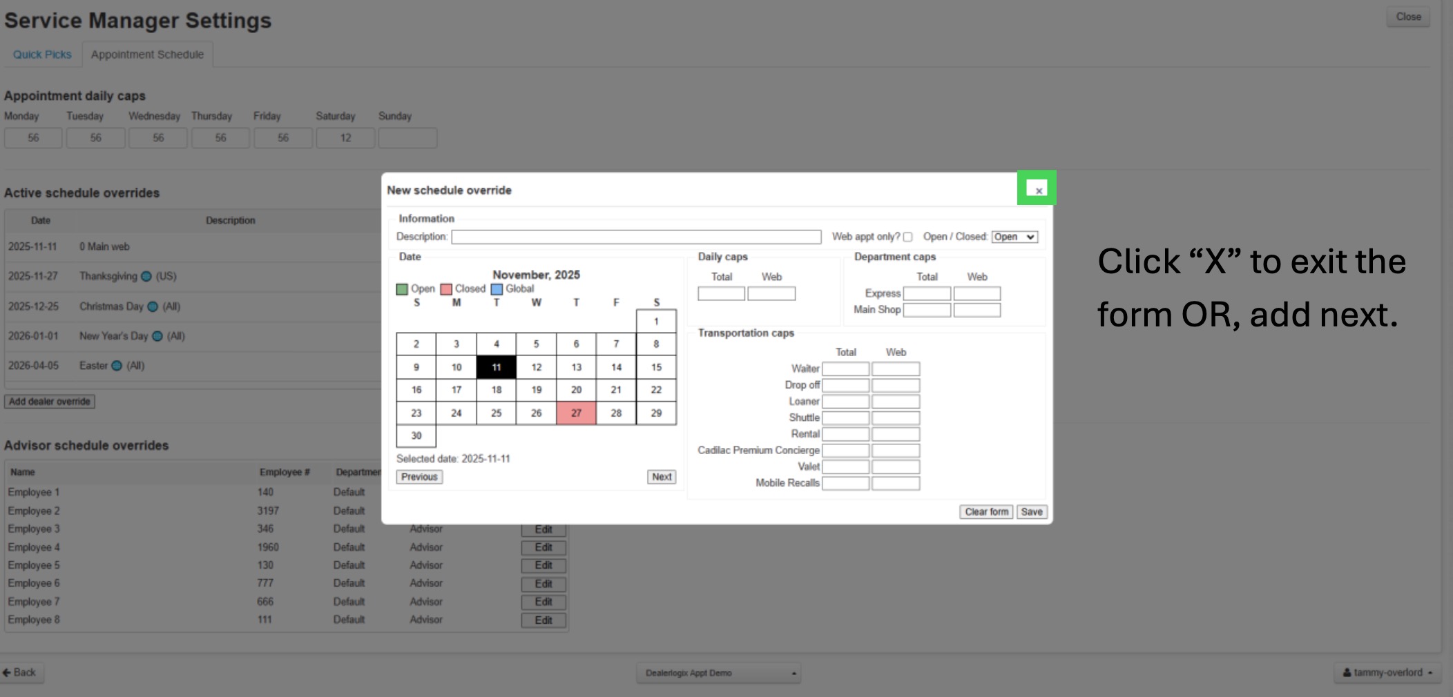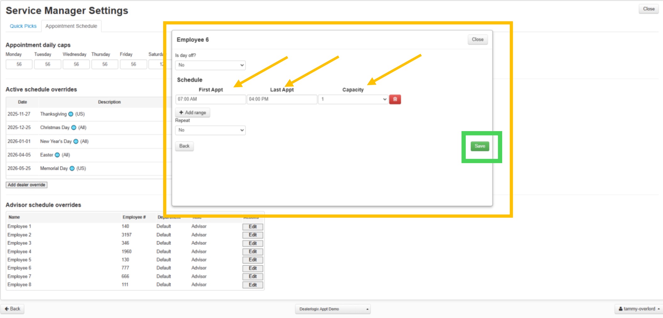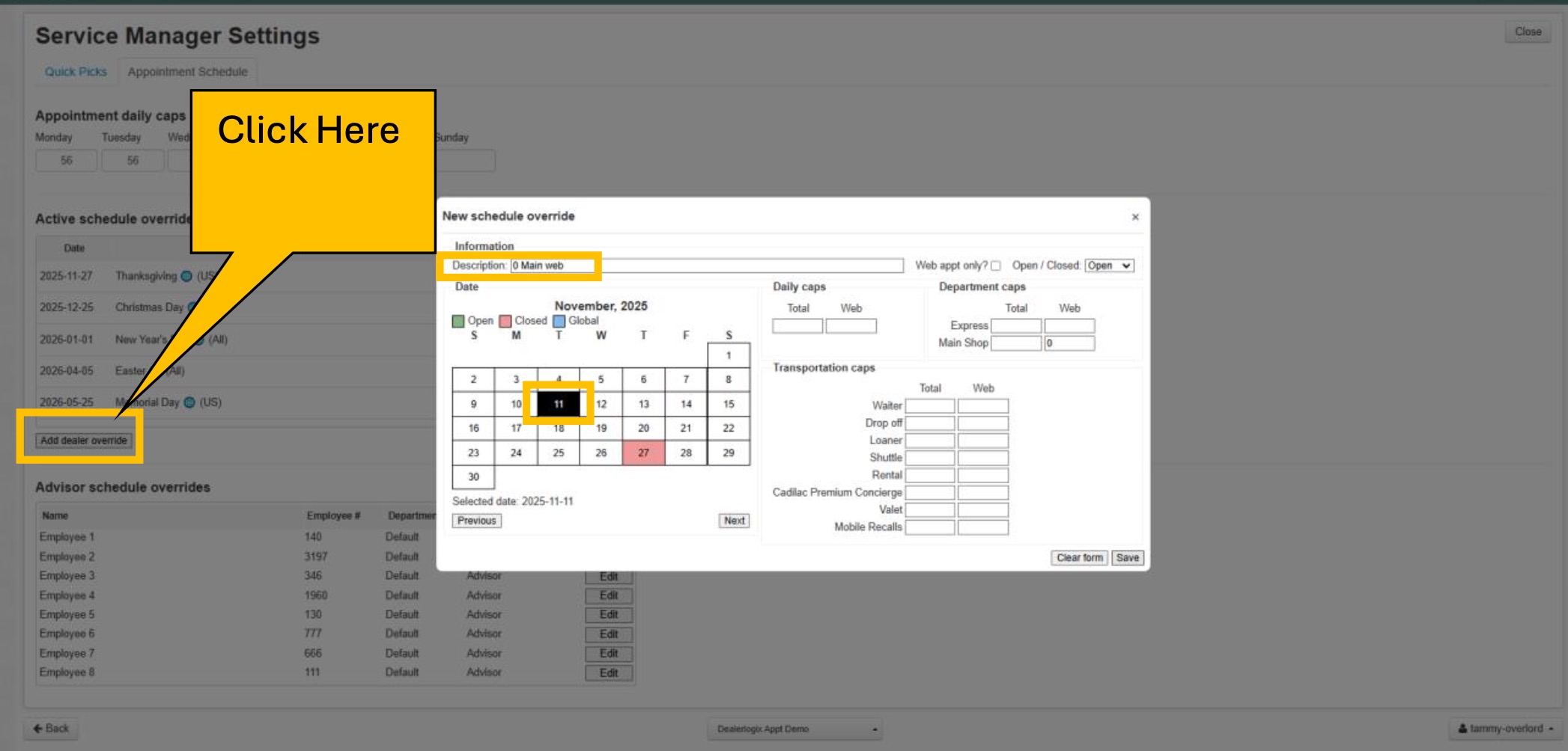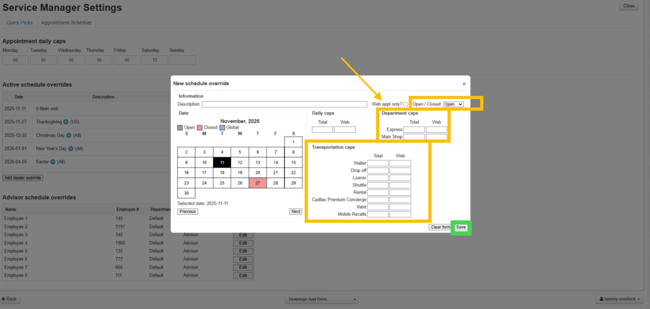 3. Manage department caps for “Express” and “Main Shop” appointments.